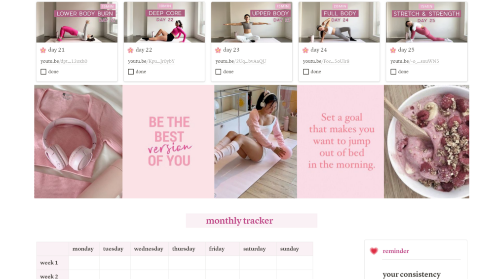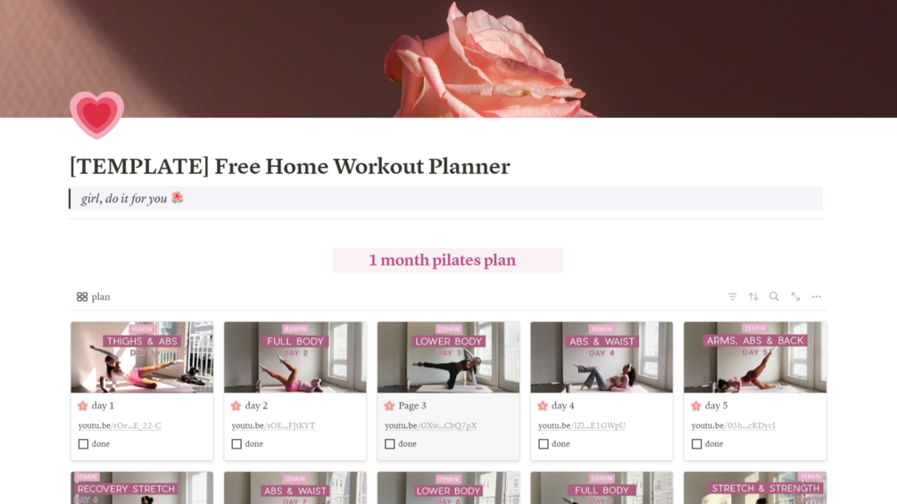 🎀 Free Home Workout Planner Notion template includes a 1-month pilates plan and a monthly tracker to monitor your progress.
